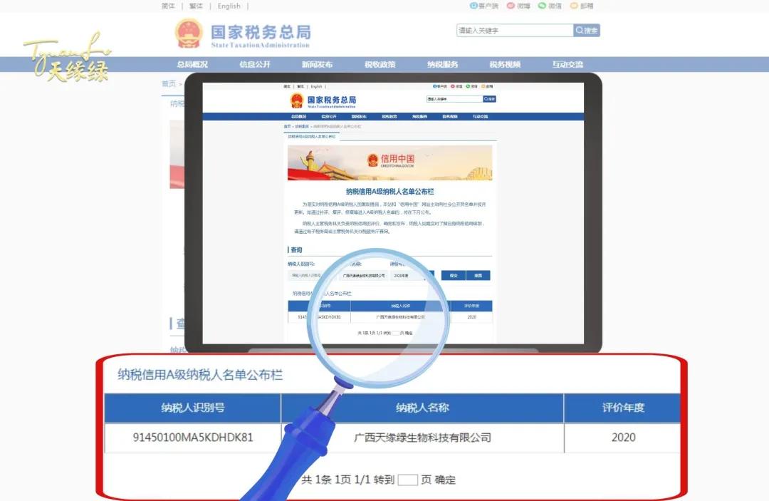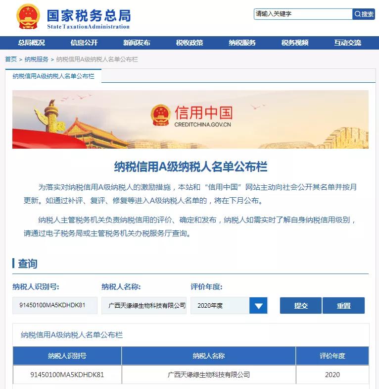 近日,国家税务总局广西壮族自治区税务局公布了《2020年度纳税信用A级纳税人名单》,天缘绿集团母公司“广西天缘绿生物科技有限公司”获评为2020年度“纳税信用A级纳税人”。