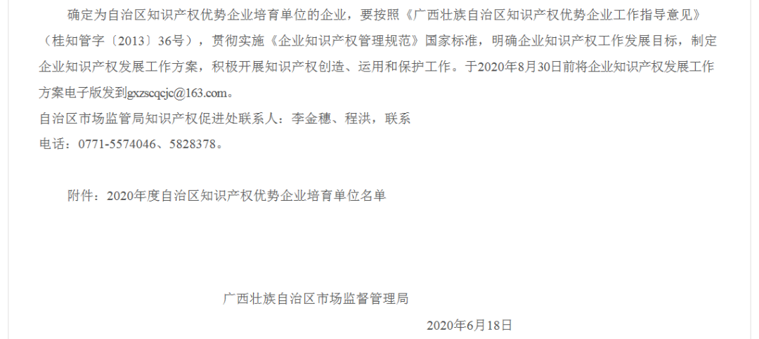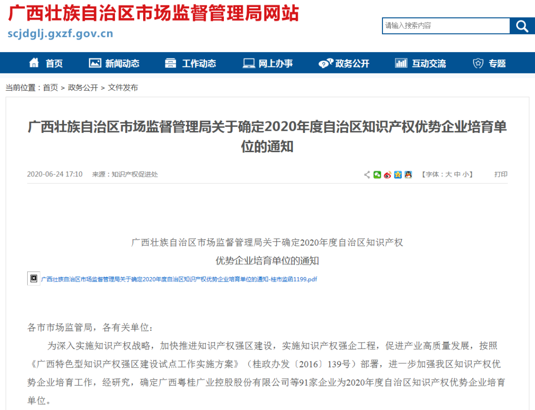 2020年6月18日,广西壮族自治区市场监督管理局发布《关于确定2020年度自治区知识产权优势企业培育单位的通知》,集团母公司广西天缘绿生物科技有限公司凭借自主研发创新能力、科研成果转化优势以及完善的知识产权管理体系,通过自治区市场监督管理局严格审核后,确定为2020年度自治区知识产权优势企业培育单位。