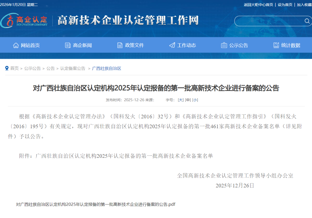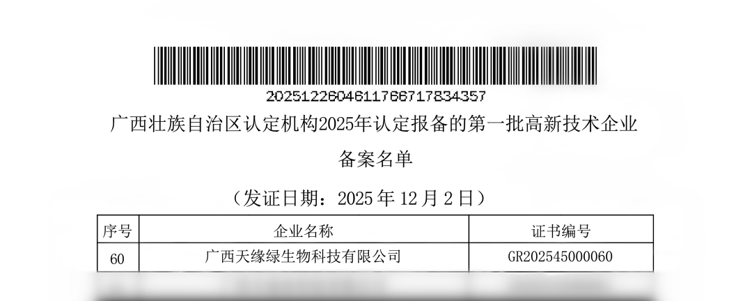 近日,全国高新技术企业认定管理工作领导小组办公室发布公告,对广西壮族自治区认定机构2025年认定报备的第一批高新技术企业备案名单予以公示。在这份含金量十足的名单中,天缘绿集团母公司——广西天缘绿生物科技有限公司,凭借持续创新的科技实力与扎实的研发成果,顺利通过三年一次的严格评审,再次荣获“国家高新技术企业”!