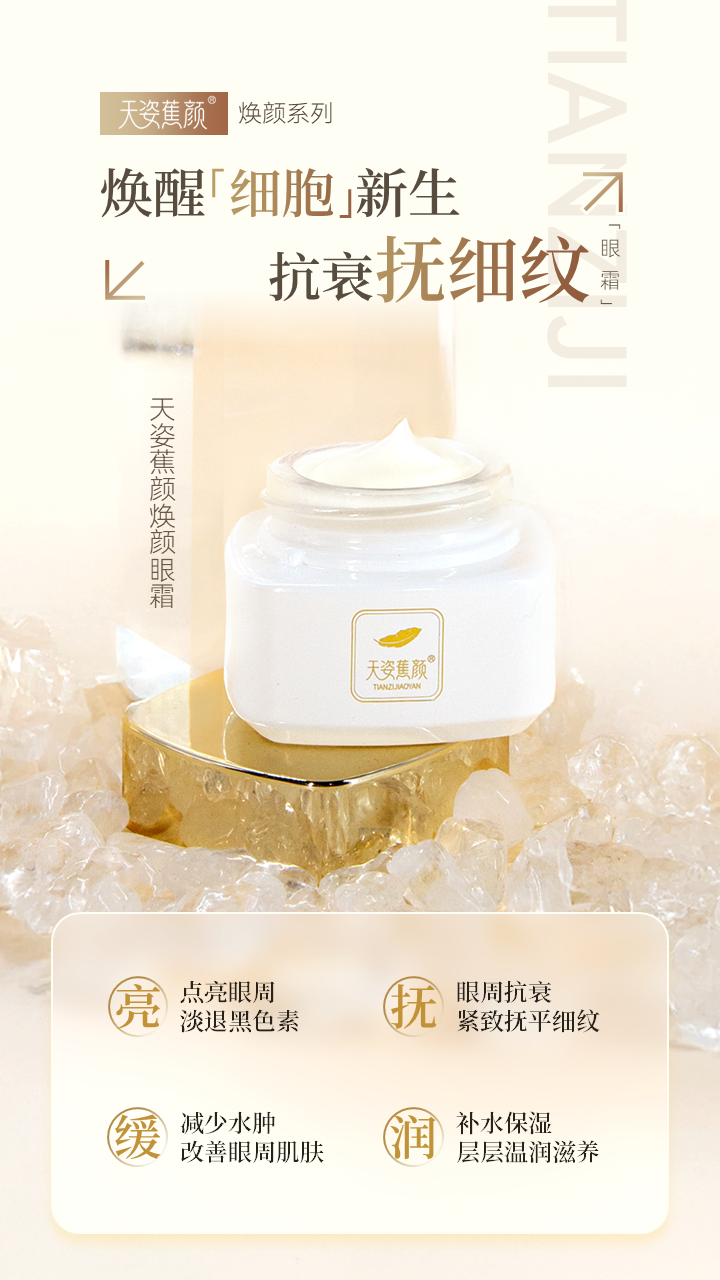 天姿蕉颜焕颜眼霜,蕴含麦角硫因、依克多因、类蛇毒肽等珍贵抗衰修护成分,同时甄选天然植物大蕉果、芦荟、甘草根、当归根、山茱萸果等多种植萃精华。