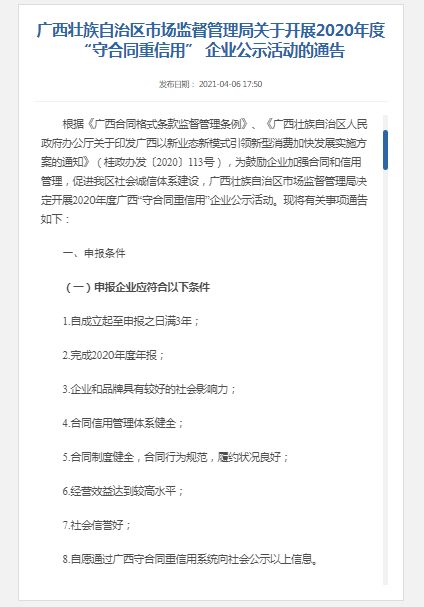 据悉,今年4月起,自治区市场监管局组织开展了2020年度广西“守合同 重信用”企业公示活动,旨在规范企业合同行为,引导企业诚信履约、守法经营,推进企业诚信建设,是社会信用体系建设的重要组成部分。
