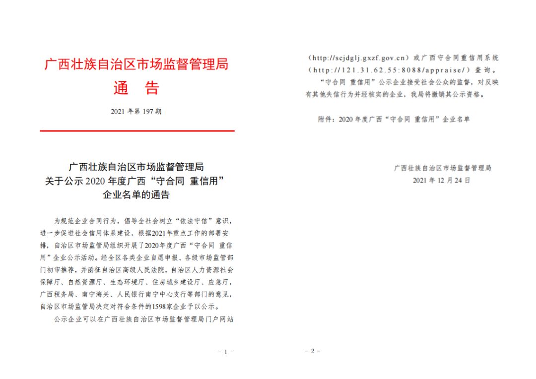 近日,广西壮族自治区市场监督管理局通告公示了2020年度广西“守合同 重信用”企业名单,天缘绿集团母公司-广西天缘绿生物科技有限公司和集团子公司-广西中绿医药科技有限公司双双获评上榜。