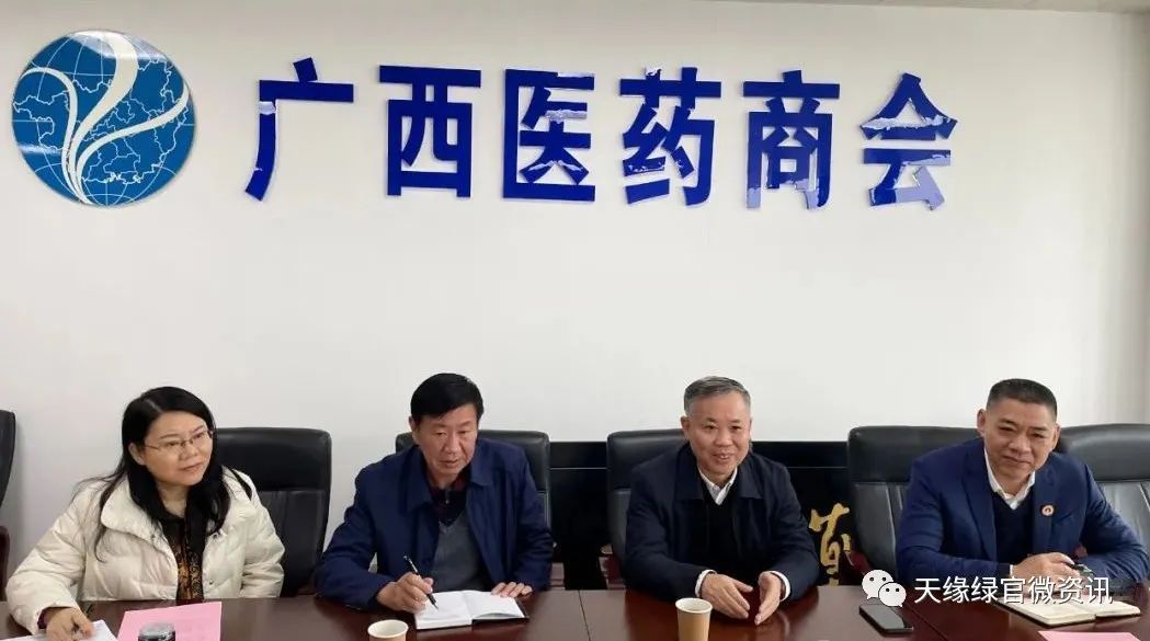 天缘绿集团运营总裁郭阳作为广西医药商会副会长与广西医药商会会长朱朝阳、党支部书记黄建国、常务副会长兼秘书长韦天宝热情的接待了磨主席一行来访。