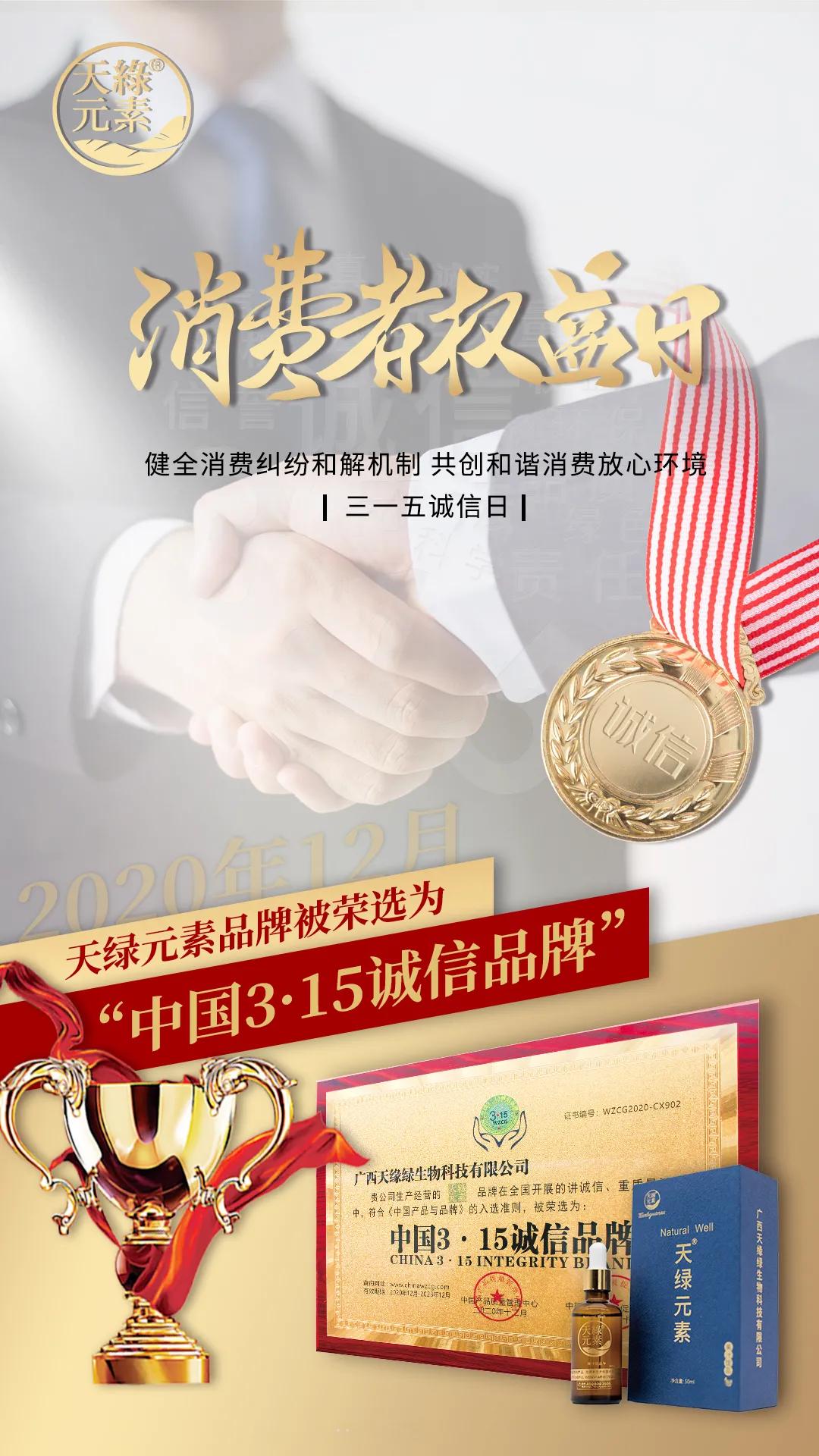 2020年12月,天缘绿集团母公司--广西天缘绿生物科技有限公司因经营的“天绿元素”系列产品品质客户满意度高、企业服务到位、信誉良好,在全国开展的诚信企业评选中,被荣选为“中国3·15诚信企业”。同时,“天绿元素”品牌也凭借品质和实力,经过重重筛选和检测后,在全国开展的讲诚信、重质量活动中,符合《中国产品与品牌》的入选准则,被荣选为“中国3·15诚信品牌”。