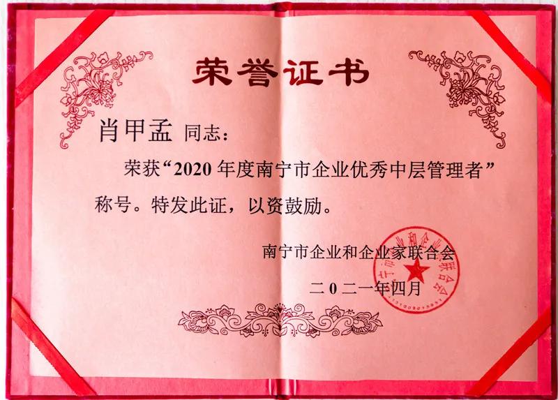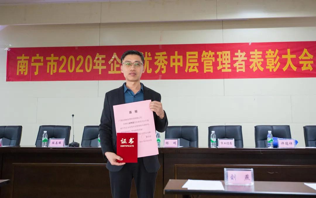天缘绿集团中层荣获了“2020年度南宁市企业优秀中层管理者”称号