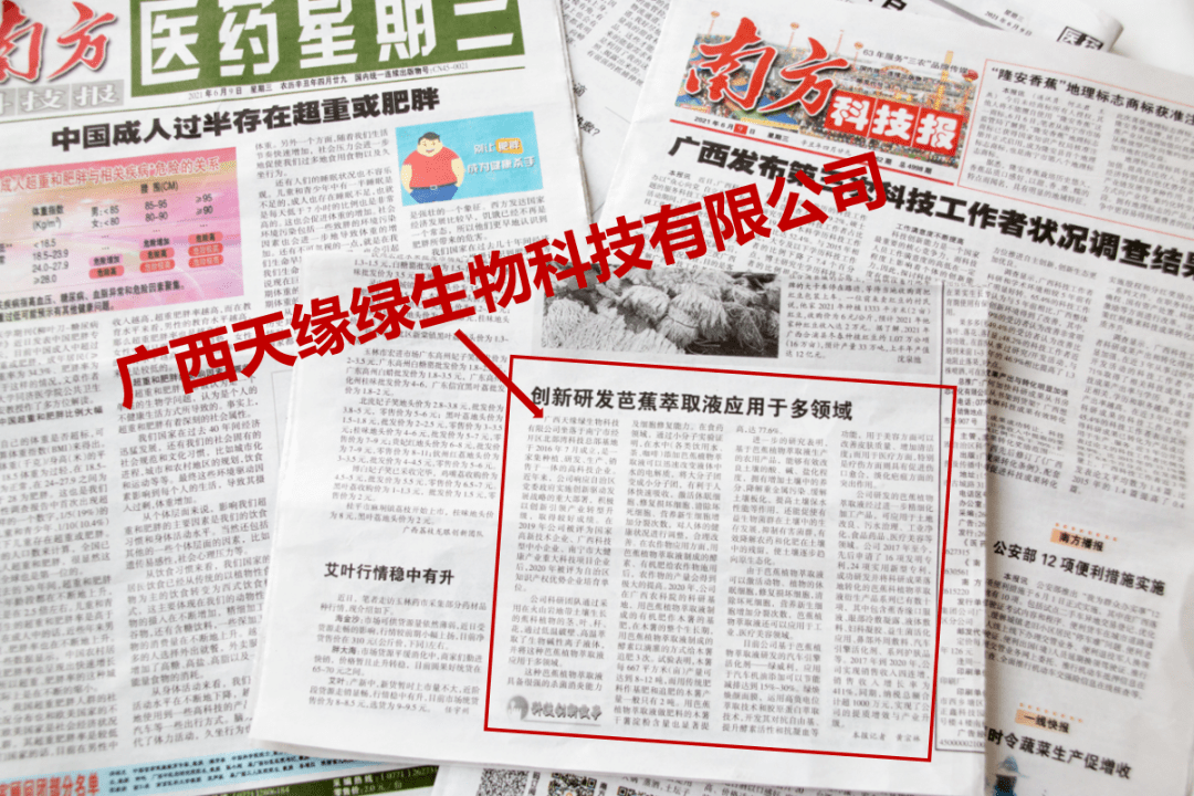 6月9日,广西区内唯一的科普类报纸--《南方科技报》刊登文章《创新研发芭蕉植物萃取液应用于多领域》,详细深入的报道了天缘绿集团母公司广西天缘绿生物科技有限公司自成立以来,一直坚持科技创新,不断拓展产业领域,其科技创新项目:芭蕉植物萃取液,广泛应用于食药、农业、工业、医疗美容等多个人类生态领域并取得优秀成果。