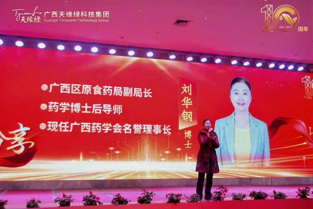 2026年1月13日,天缘绿集团十周年庆典现场,灯光聚焦,万众瞩目。当集团名誉董事长李玉强、运营总裁郭阳携手广西医科大学药学院阳洁院长、首席科研专家刘华钢博士等八位代表,共同将手掌置于启动球上,随着全场倒计时归零——“5、4、3、2、1,启动!”璀璨光芒瞬间绽放,礼炮齐鸣。
